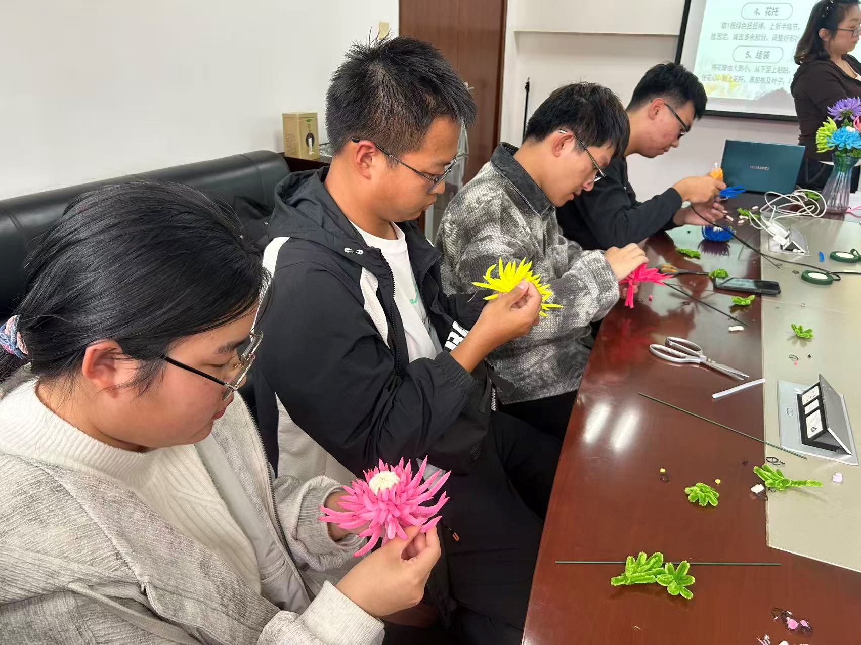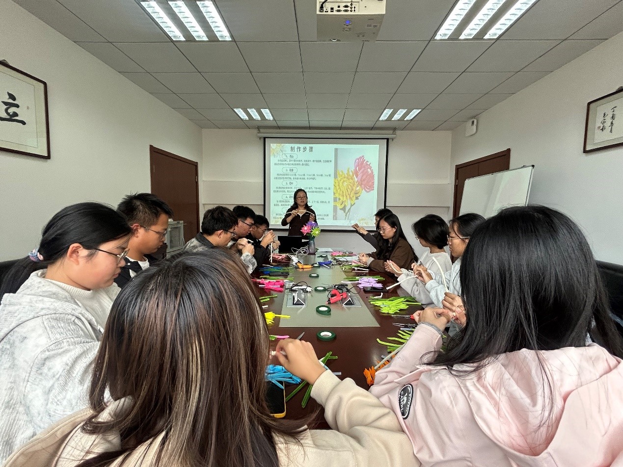 在温馨融洽的氛围中,同学们在宿管阿姨的陪伴与协助下,饶有兴致地学习制作的基本技巧。从绕圈、修剪到组合成型,每一步都凝聚着耐心与巧思。柔软的绒条在指尖翻飞,逐渐变成一朵朵栩栩如生的“菊花”。本次手工制作活动巧妙地将重阳节的节日内涵与非物质文化遗产体验相结合,不仅是一次手工艺体验,更是一次深度的文化浸润,让年轻学子在动手实践中深刻体会到传统手工艺的匠心独运与重阳佳节的人文关怀。