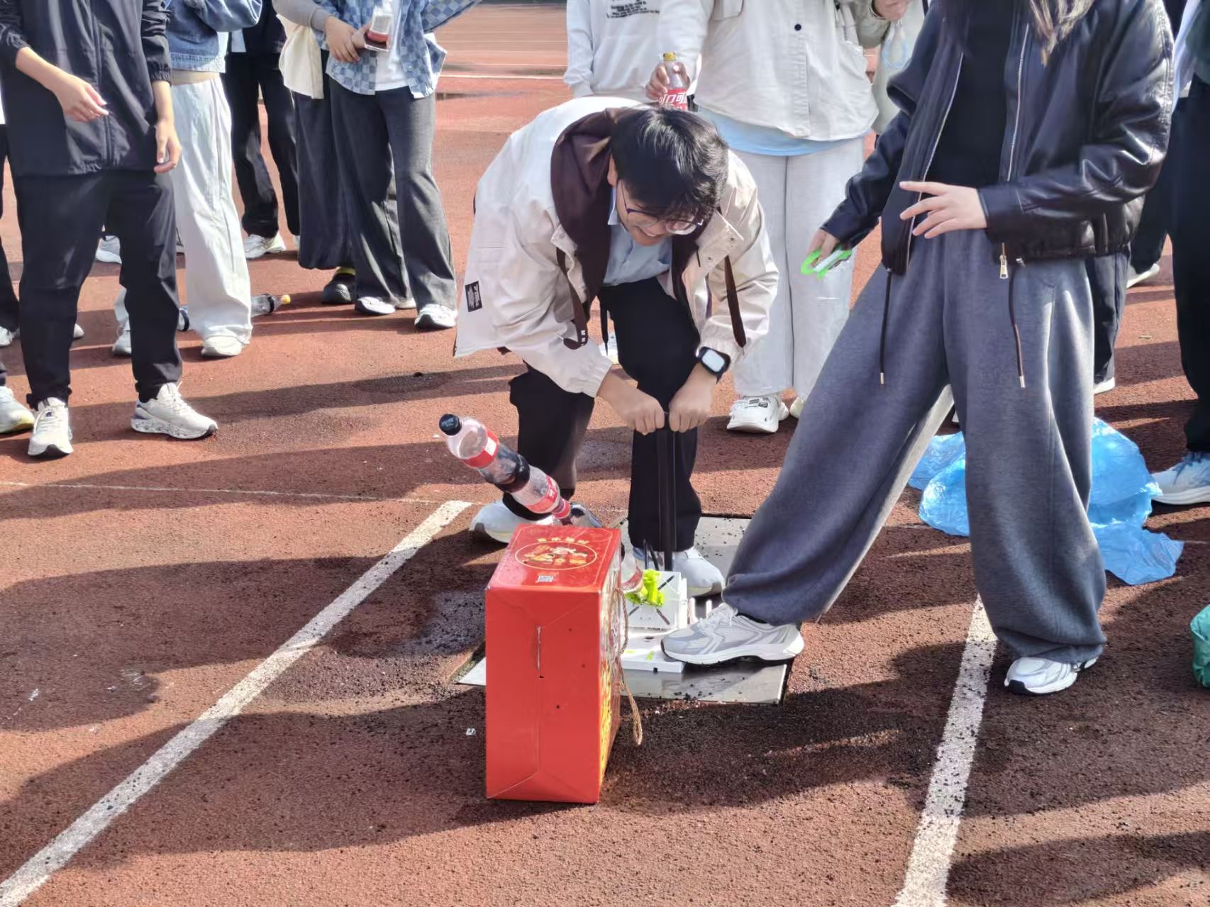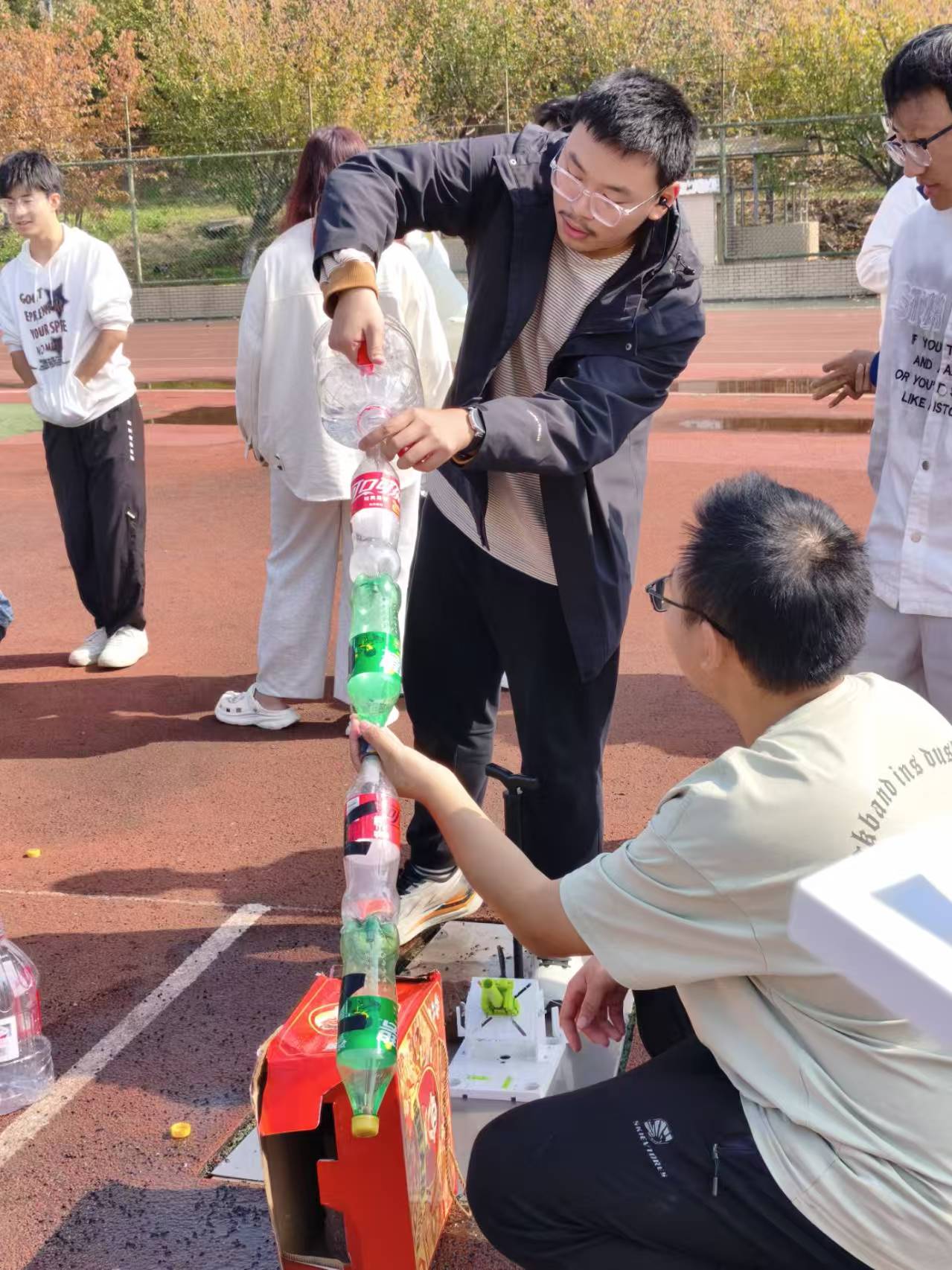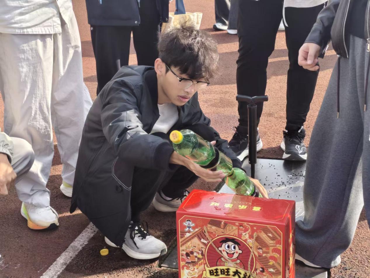 赛前,各参赛队伍在学生会工作人员的指导下,顺利完成了水火箭的设计与制作。同学们在深入理解反冲作用原理与空气动力学知识的基础上,充分发挥创意,对箭体进行了个性化的涂装与装饰,展现出科学与美学相融合的综合素养。