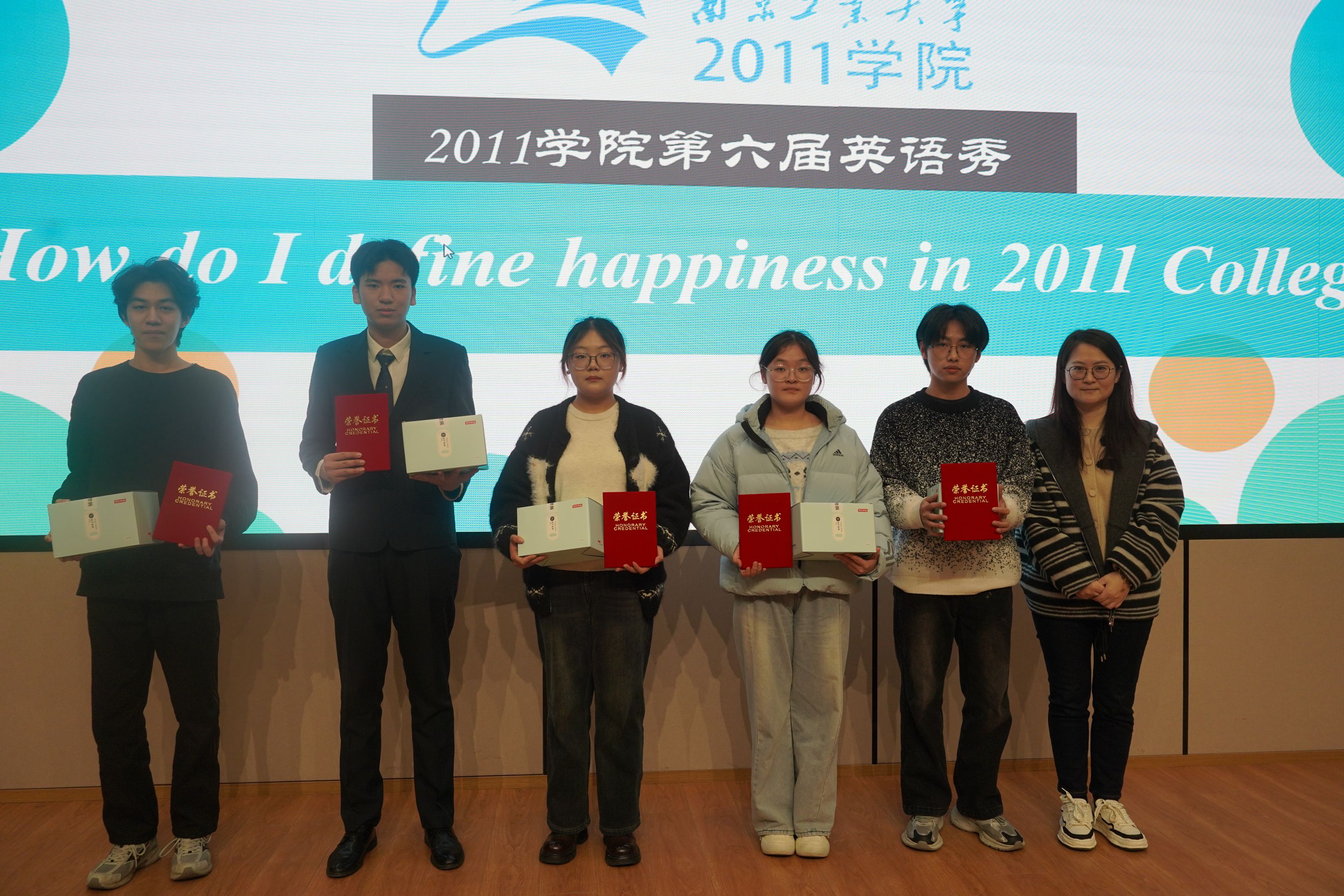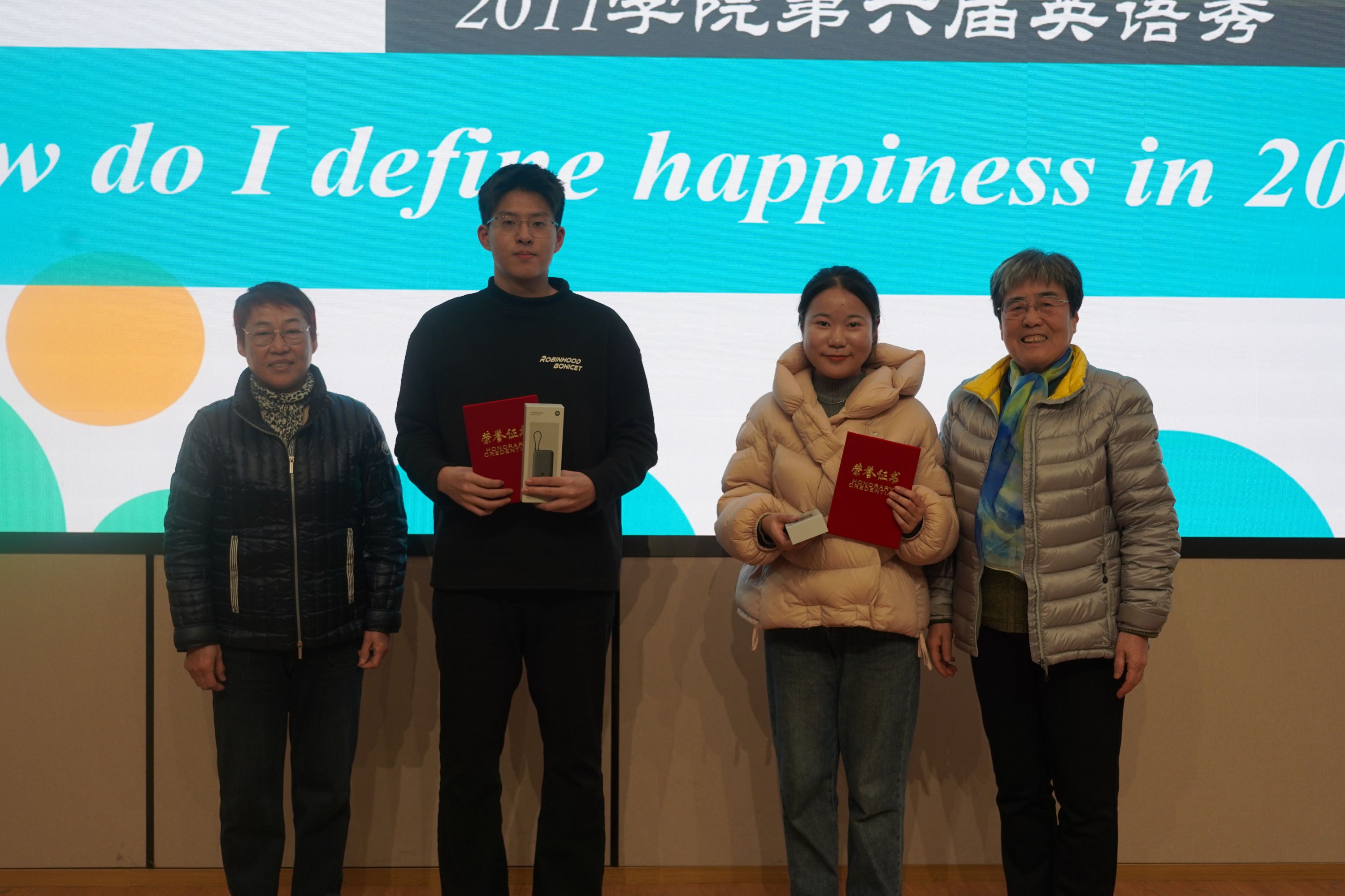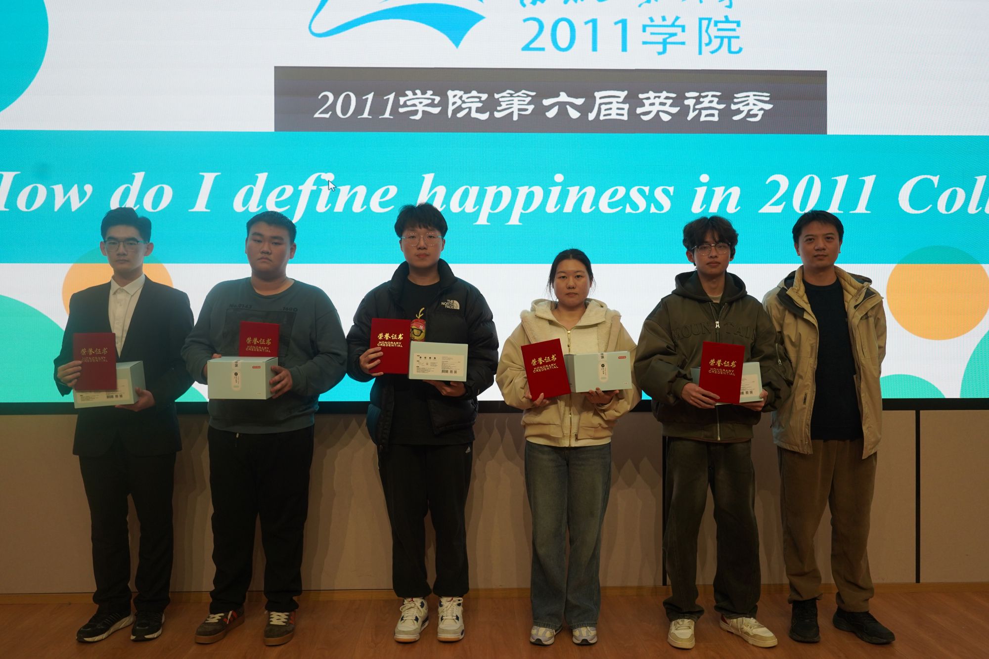 本届比赛以“How do I define happiness in 2011 College?”为主题,要求选手首先通过1分钟自我介绍视频展示个人风采,随后围绕主题进行3分钟脱稿演讲。参赛选手们结合多媒体展示,以流畅的表达及饱满的精神状态,分享了他们入学以来书院生活的点滴和对大学四年生活的美好憧憬,充分展现了同学们扎实的语言运用能力。参赛选手经过激烈角逐,最终评选出特等奖2名、一等奖4名、二等奖10名。